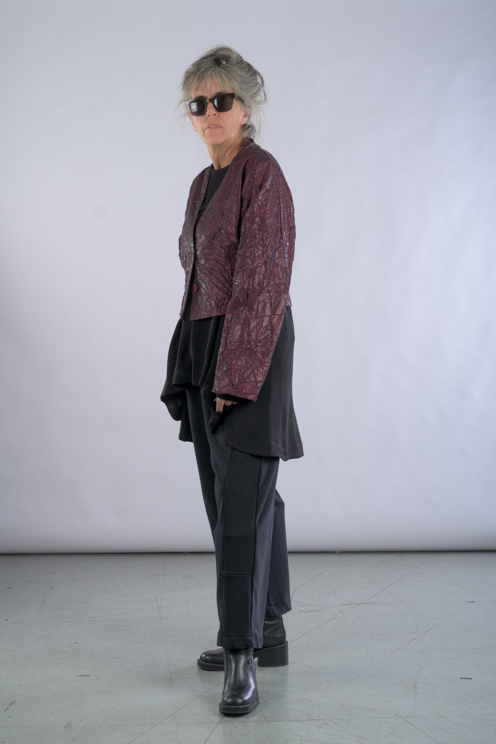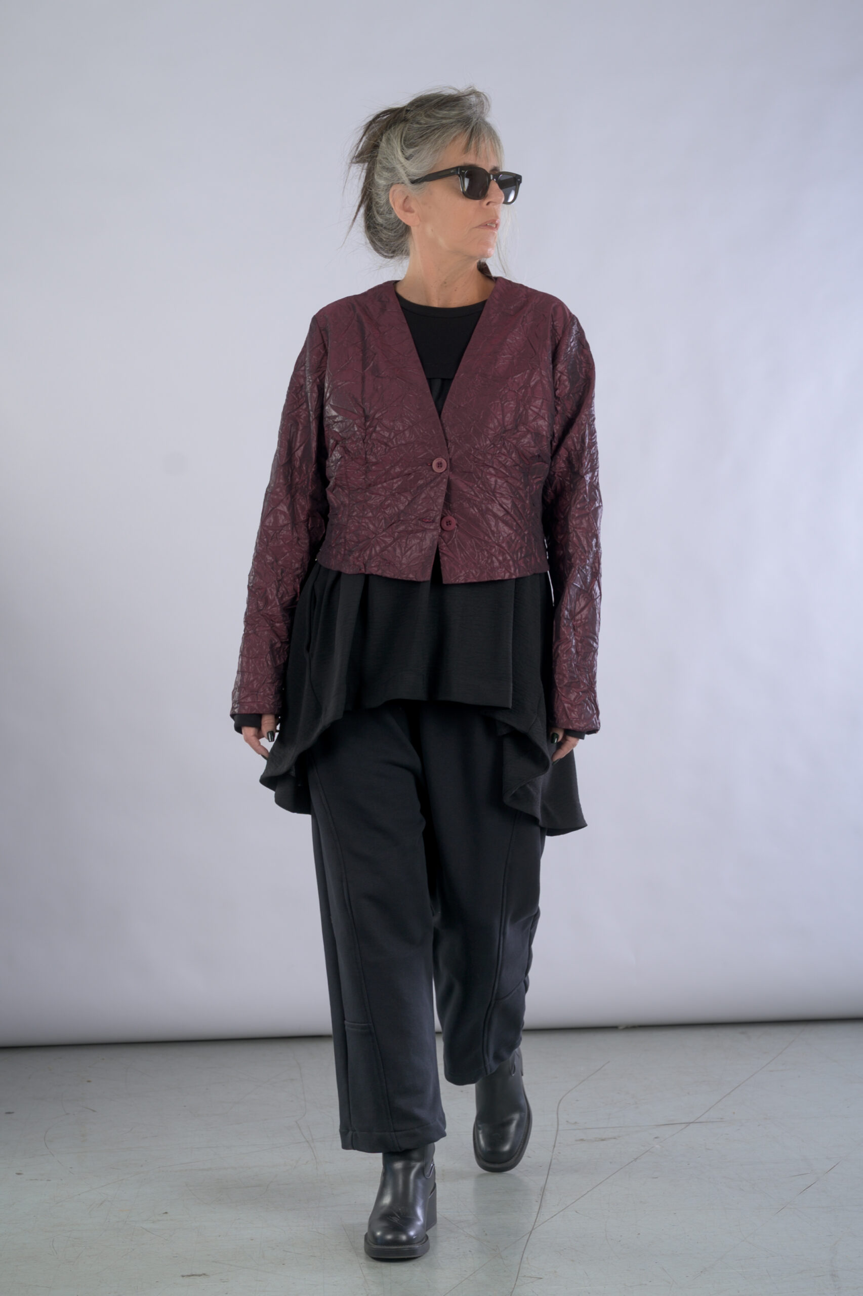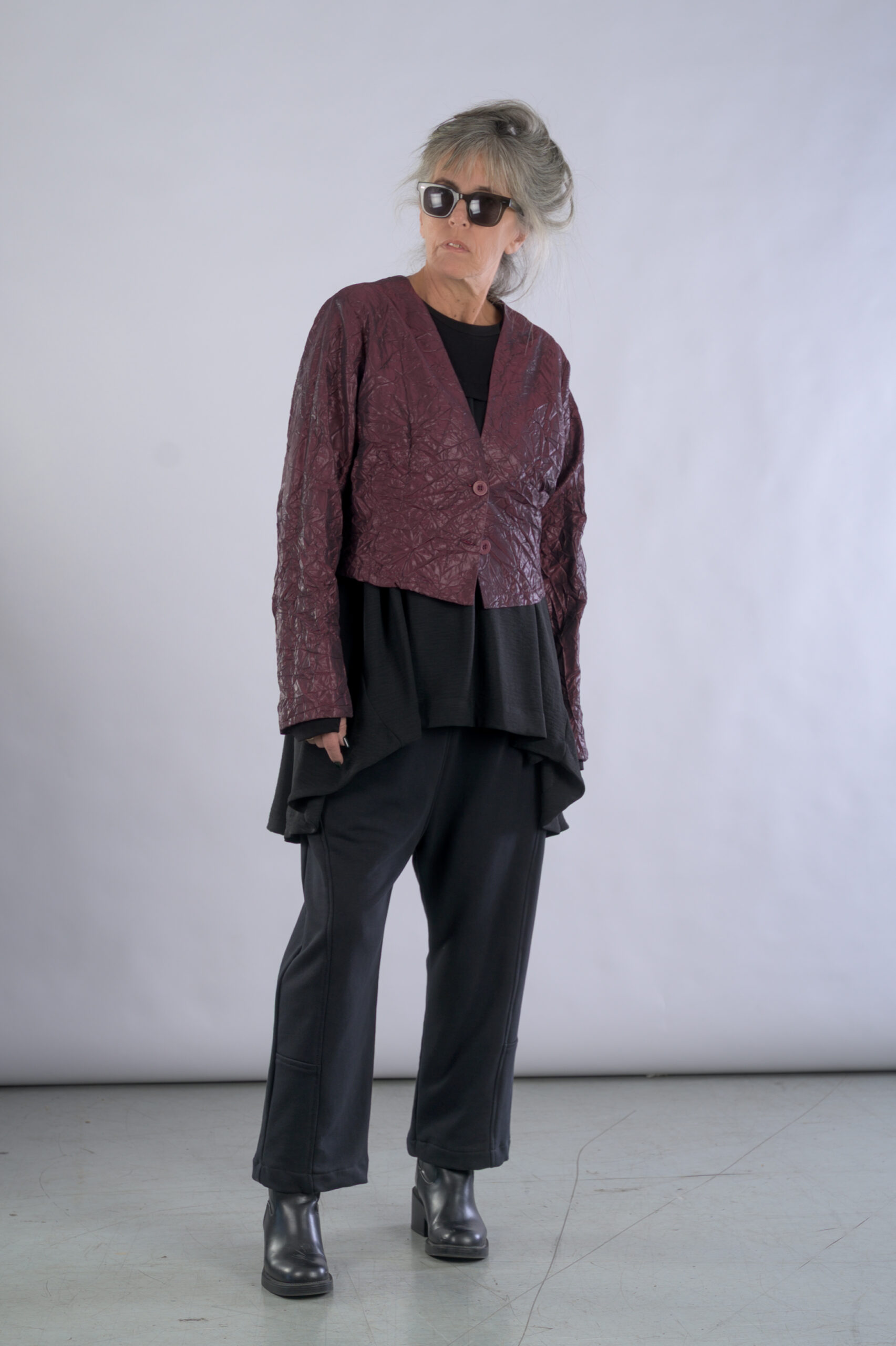 ג'קט קצר מבד מקומט מצופה לקה, עם מפתח V