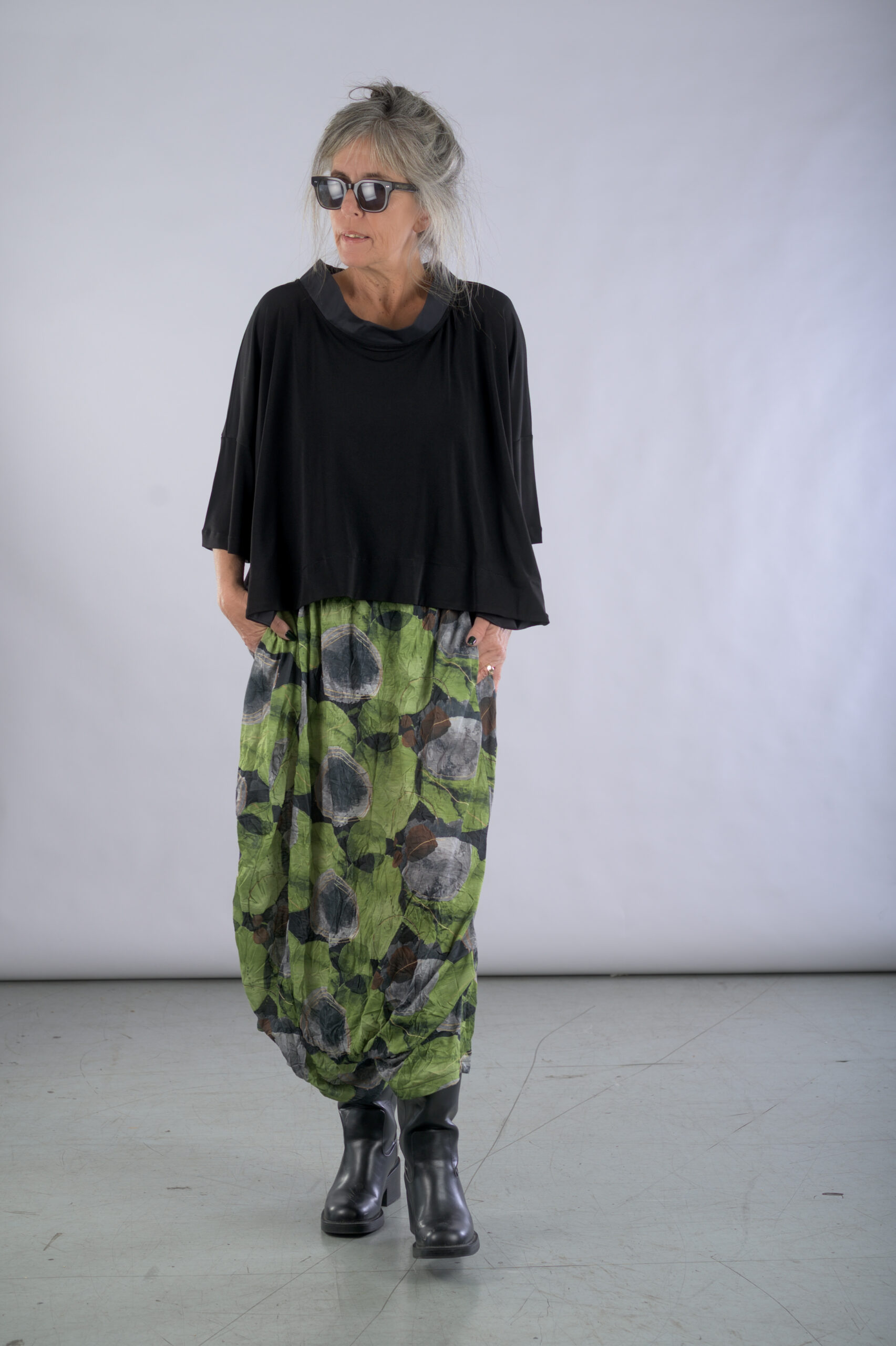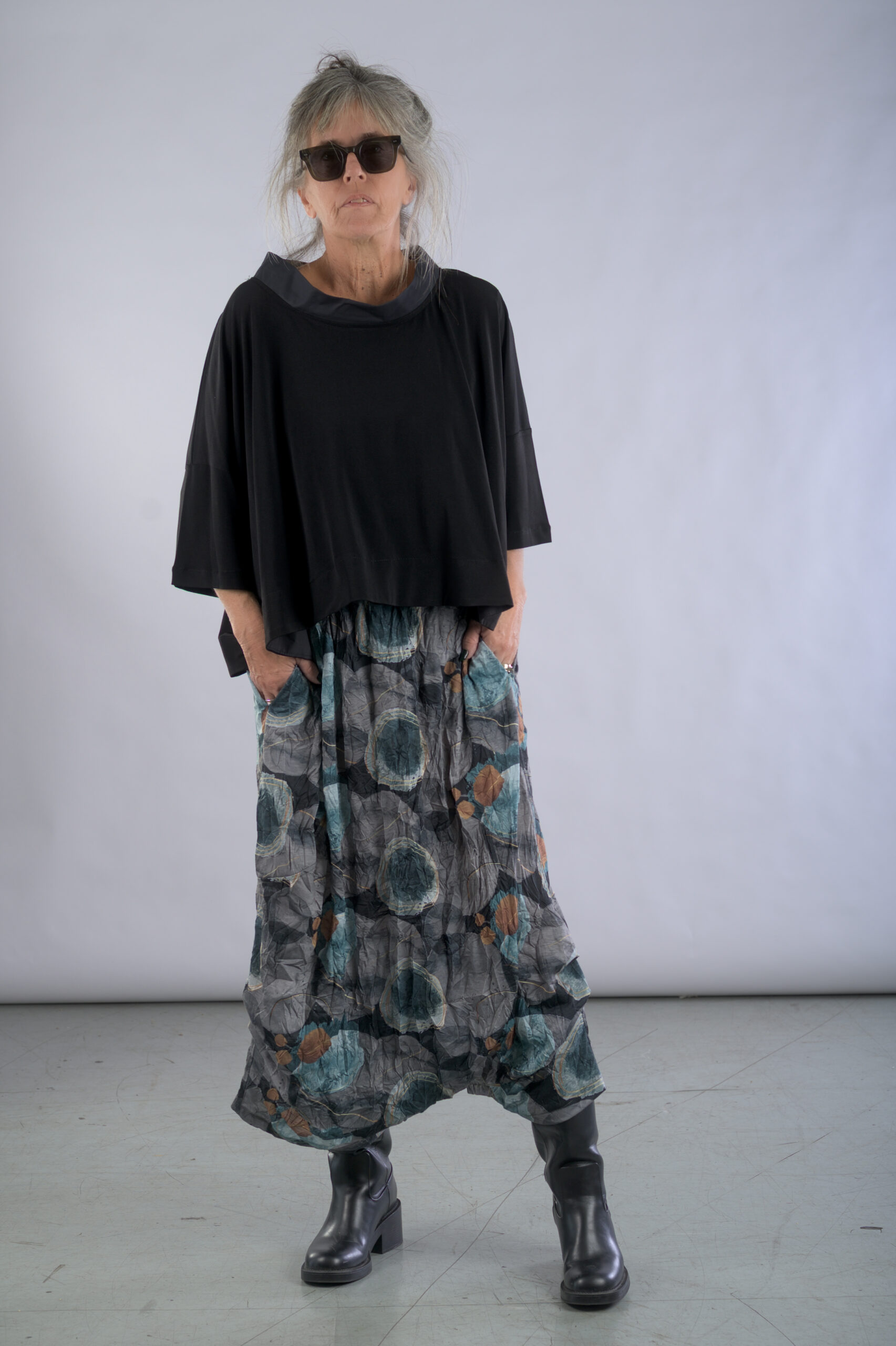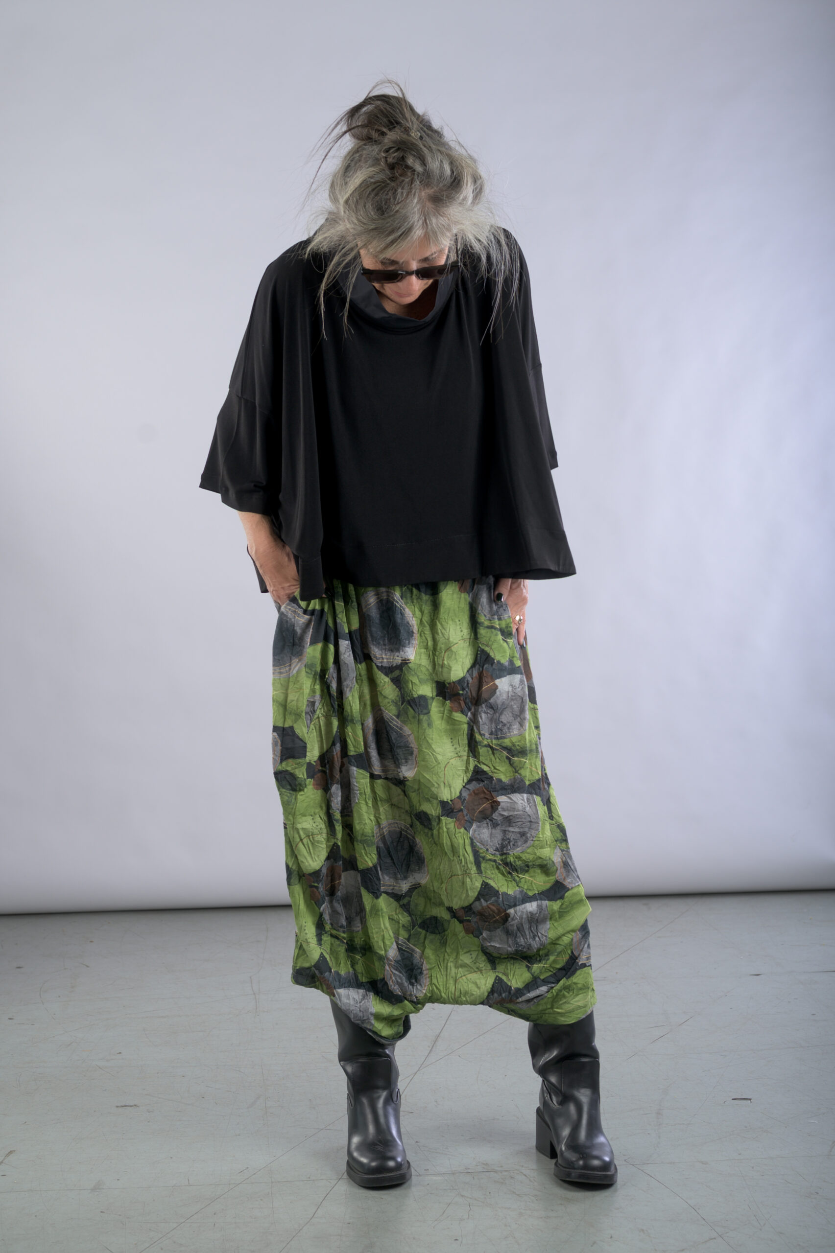 מכנסי חצאית מבד מקומט, נאספת בגב לכיוון קדמי
