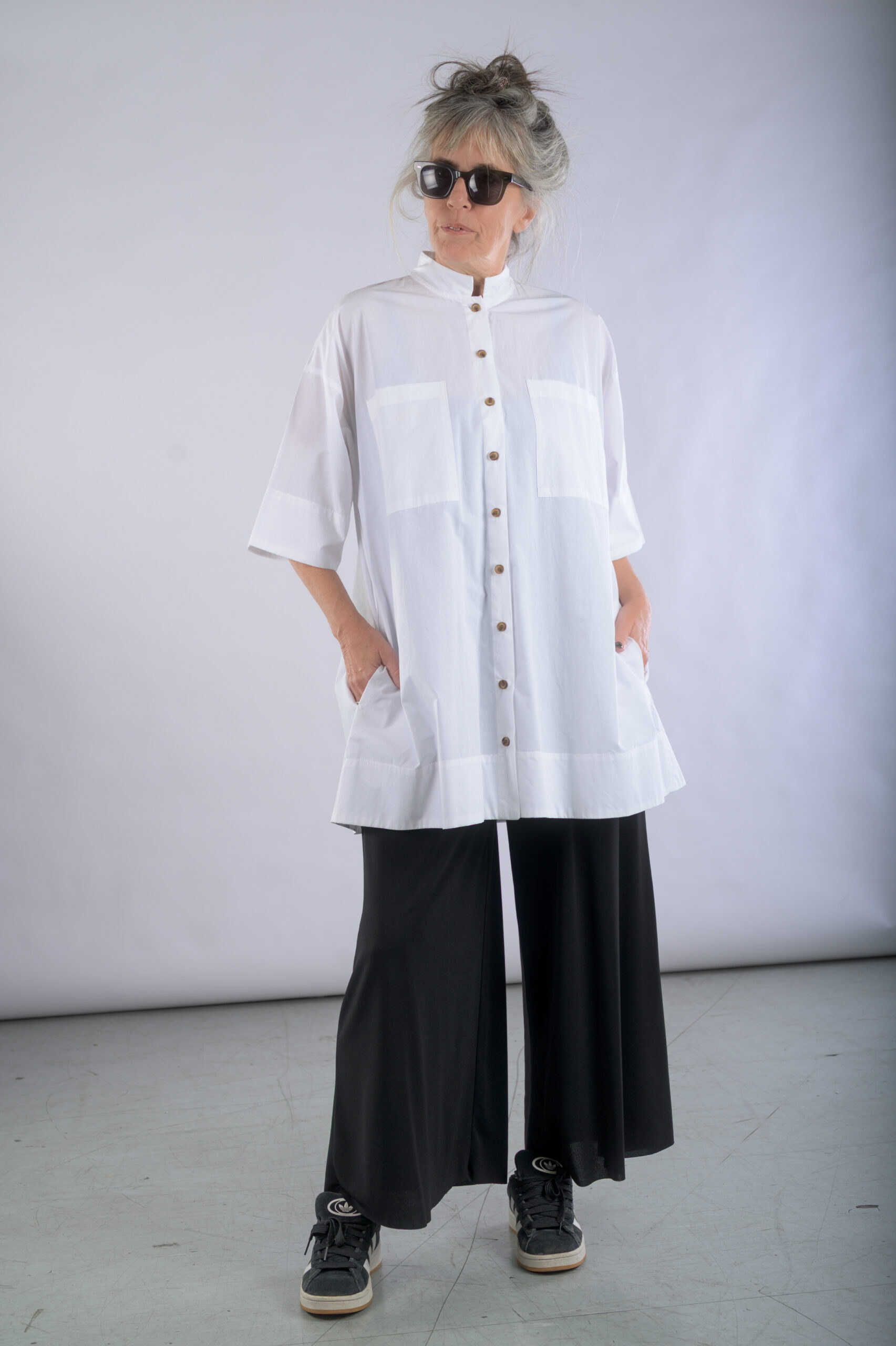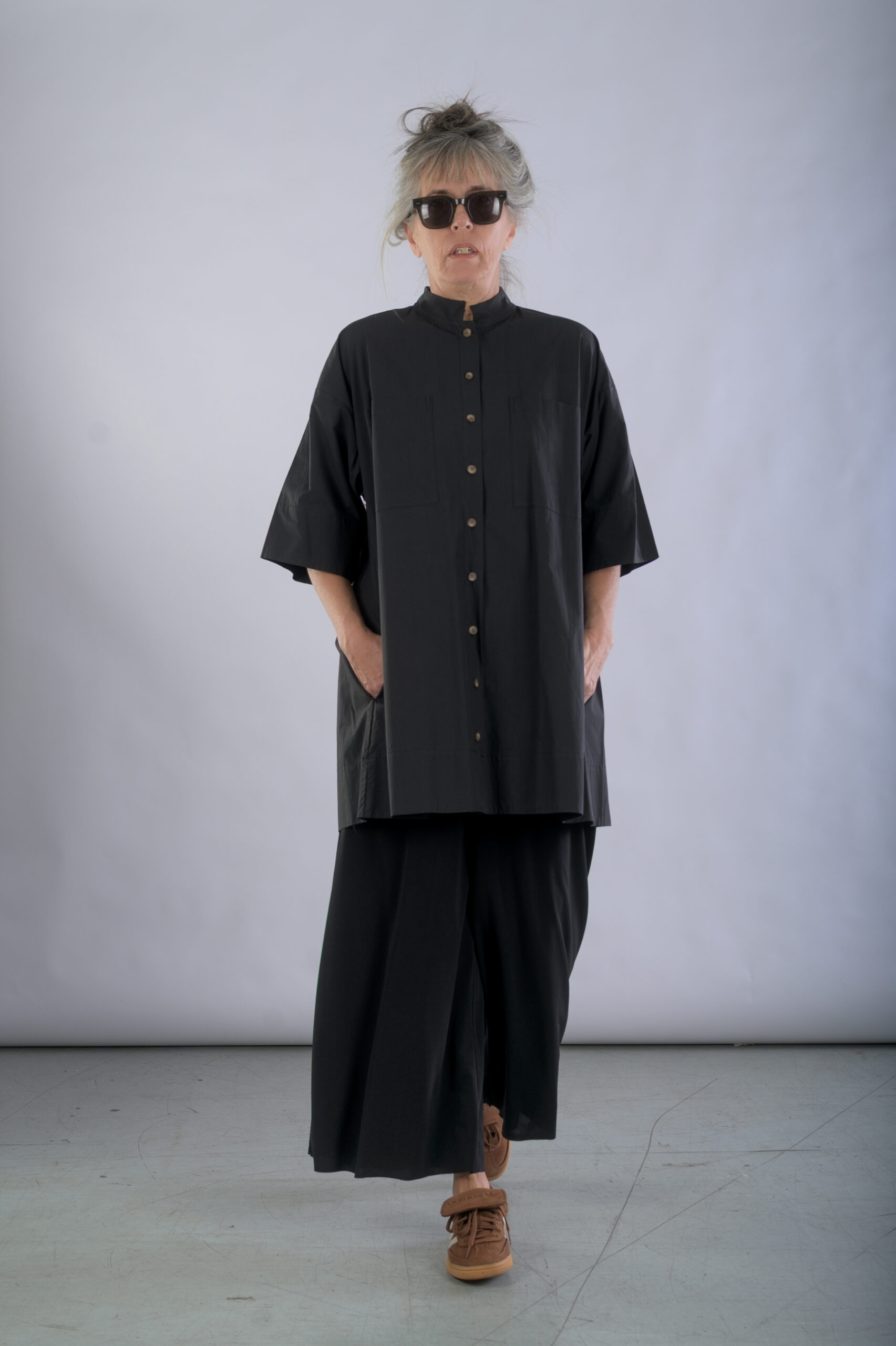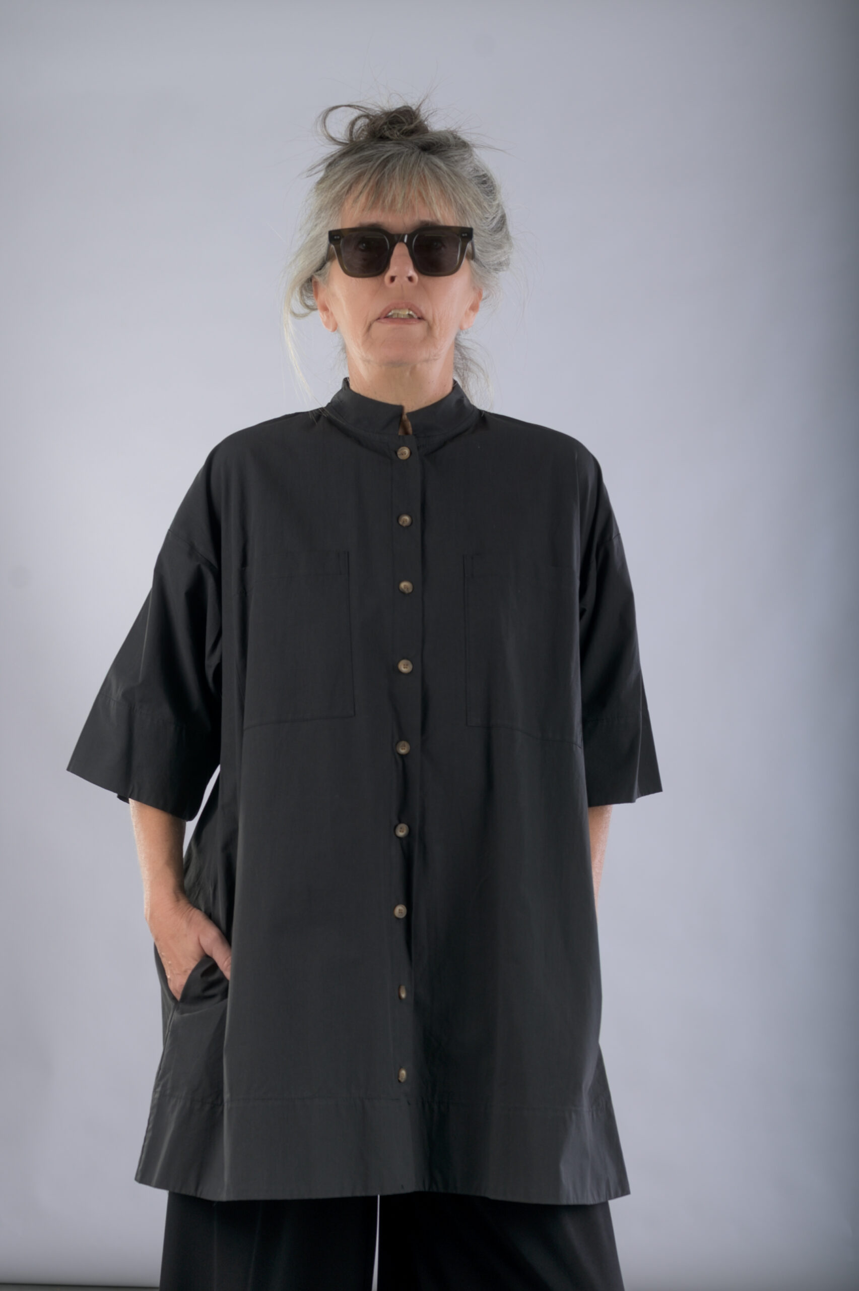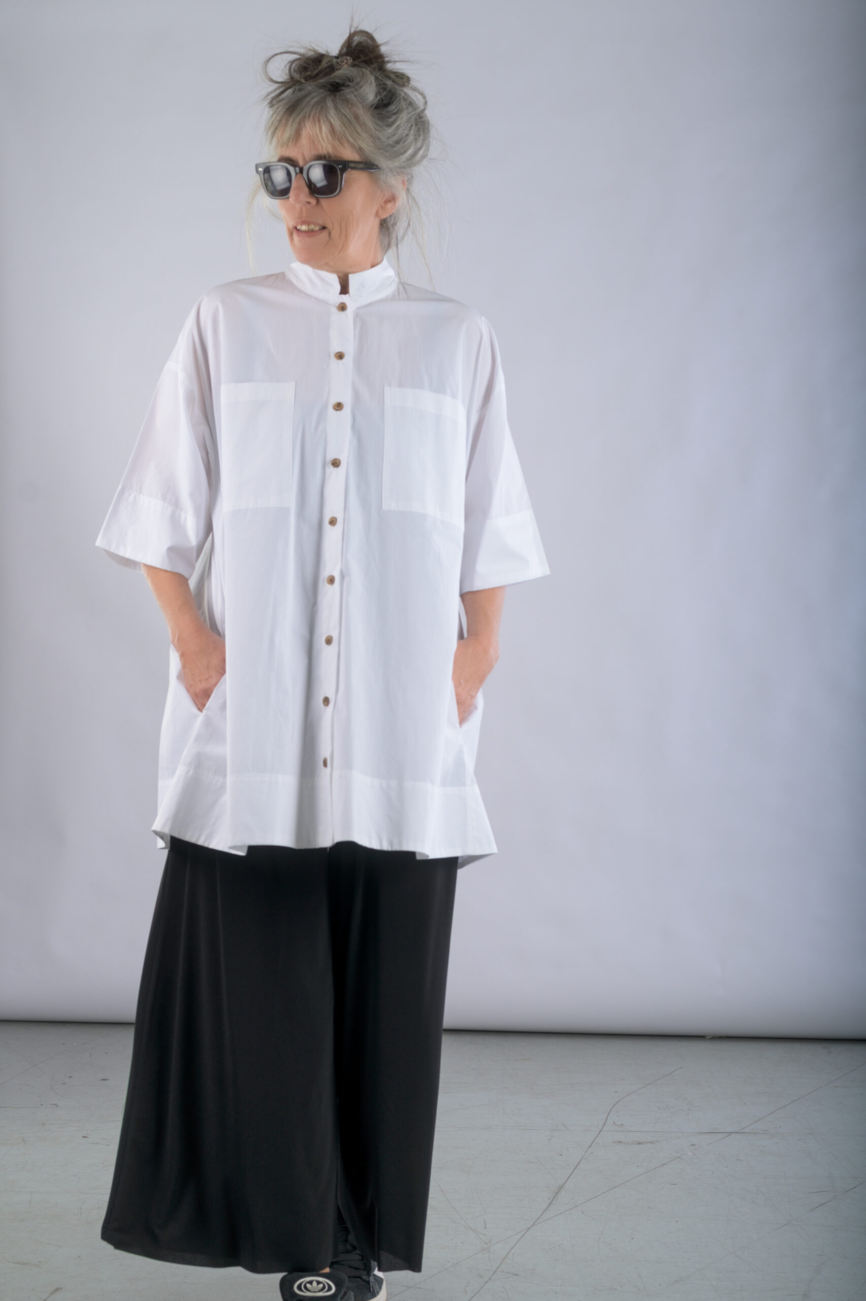 טוניקת כותנה מכופתרת, בסגנון יפני, עם צווארון עגול