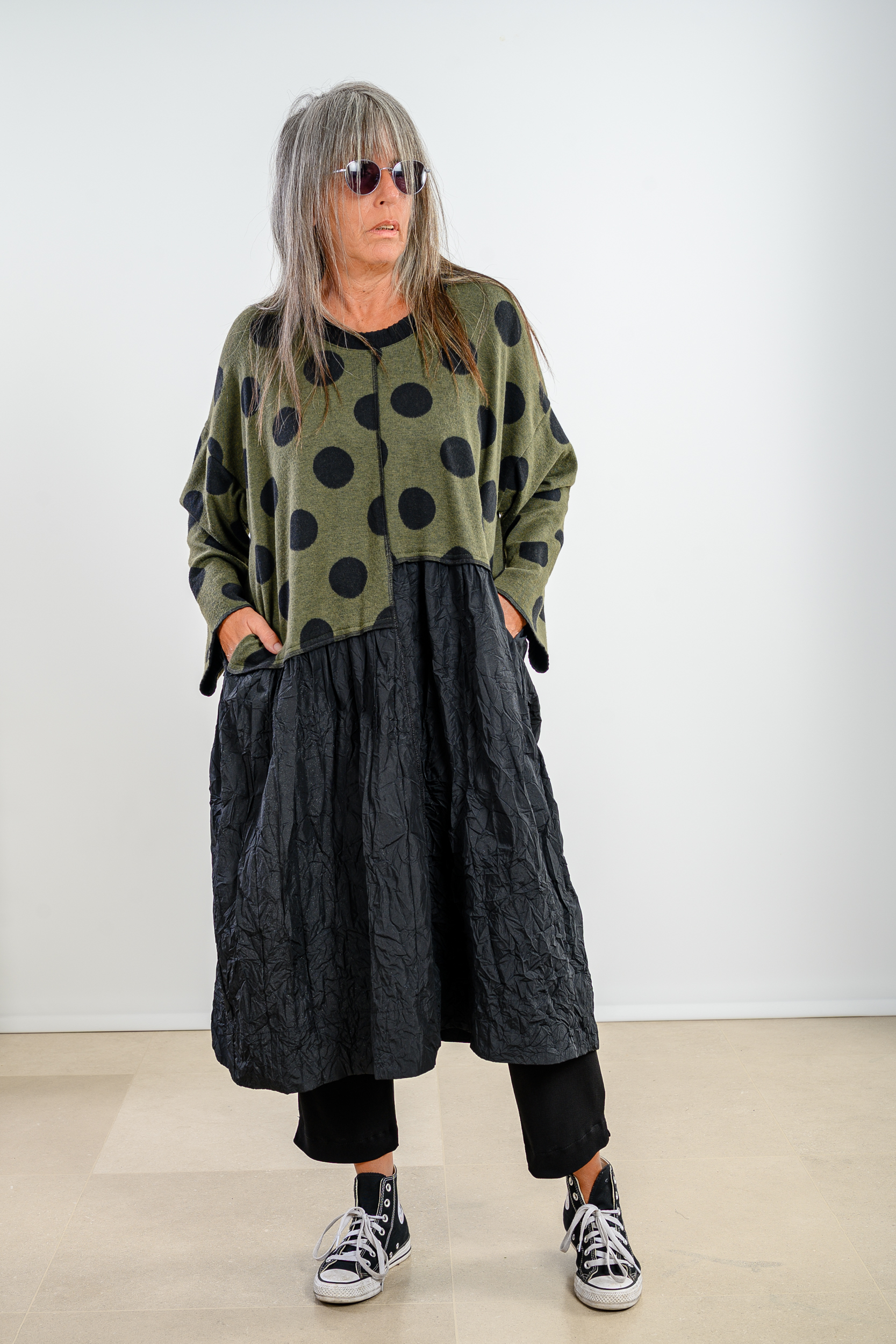 שמלת סריג נקודות אסימטרית, בשילוב טפט מקומט