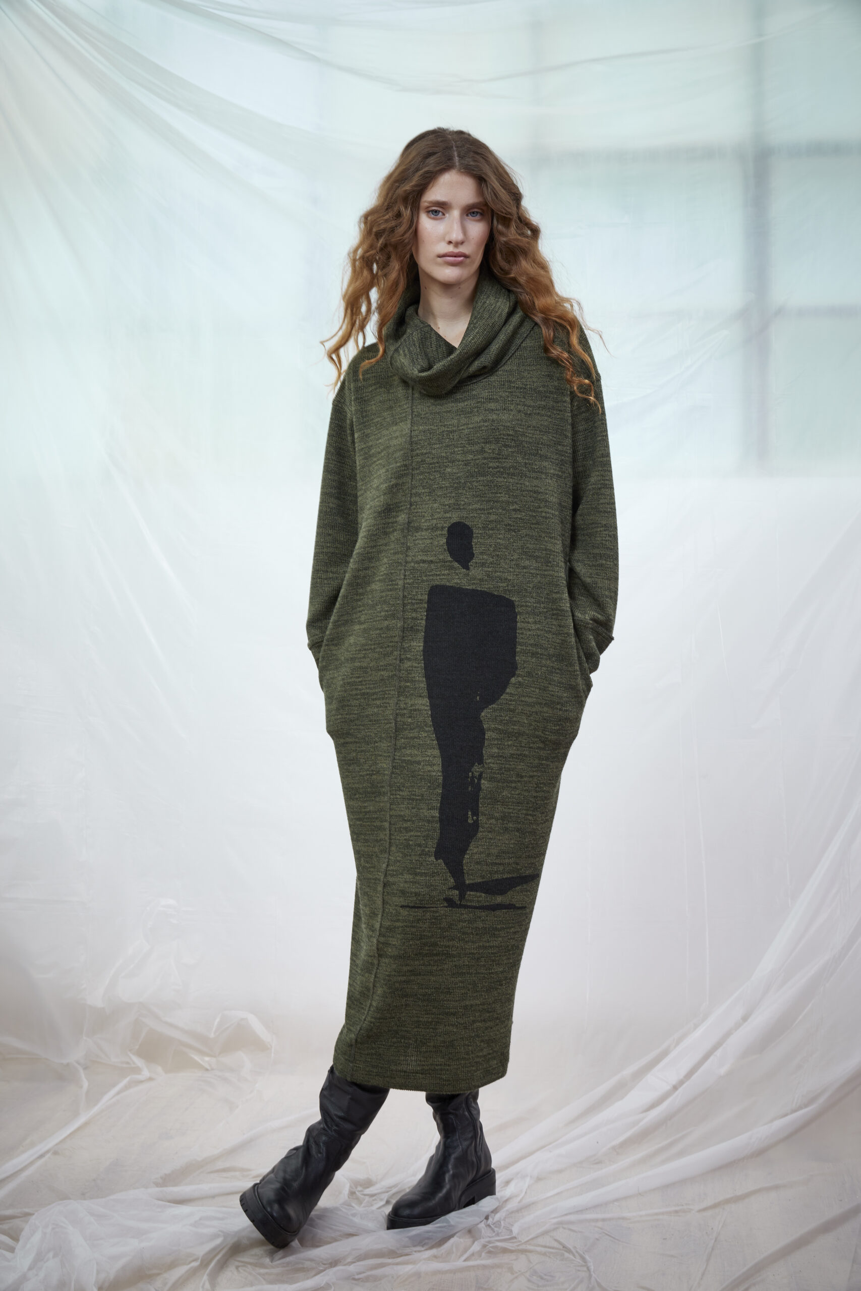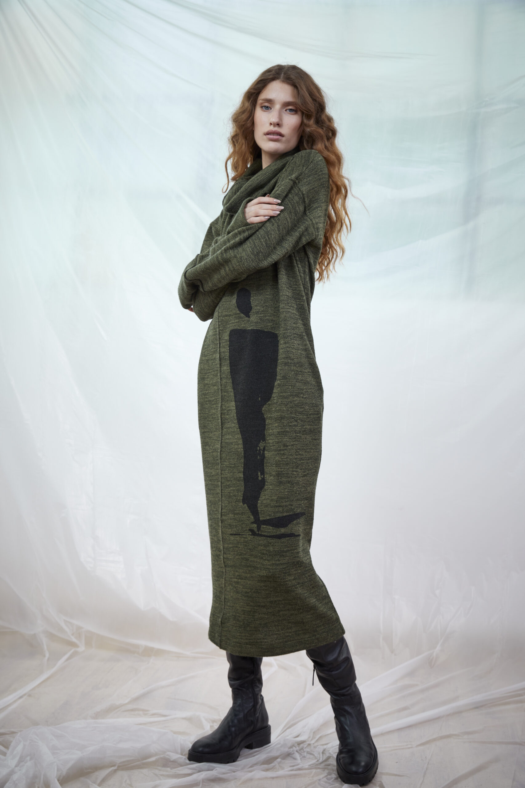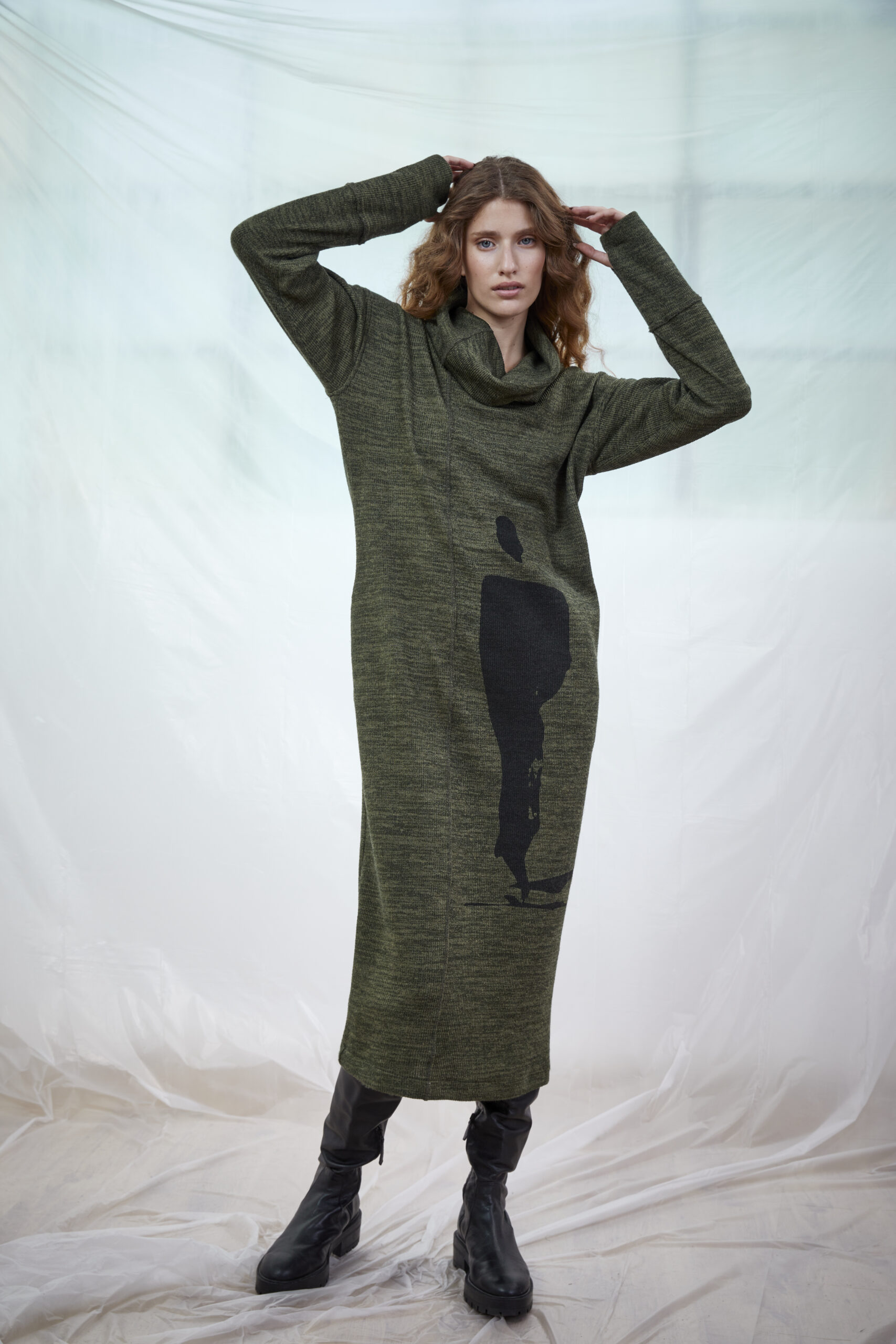 שמלת סריג בשילוב הדפס קדמי וצווארון גולף נשפך