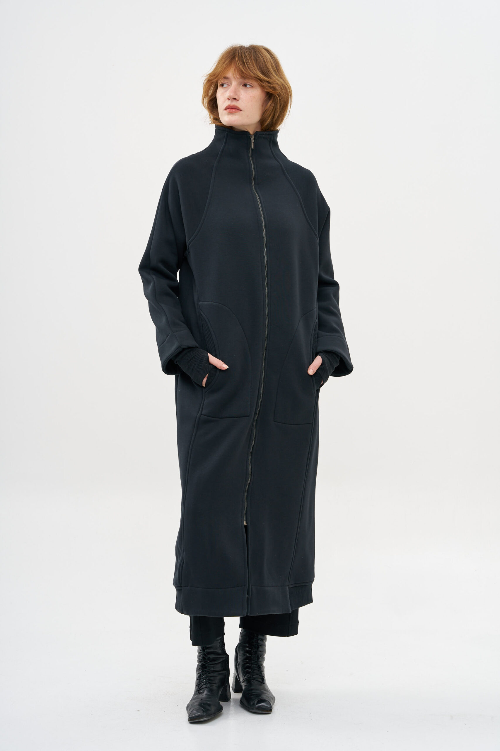 מעיל מלא נוכחות, בגזרה ישרה, עם צווארון מוגבה ורוכסן לאורכו