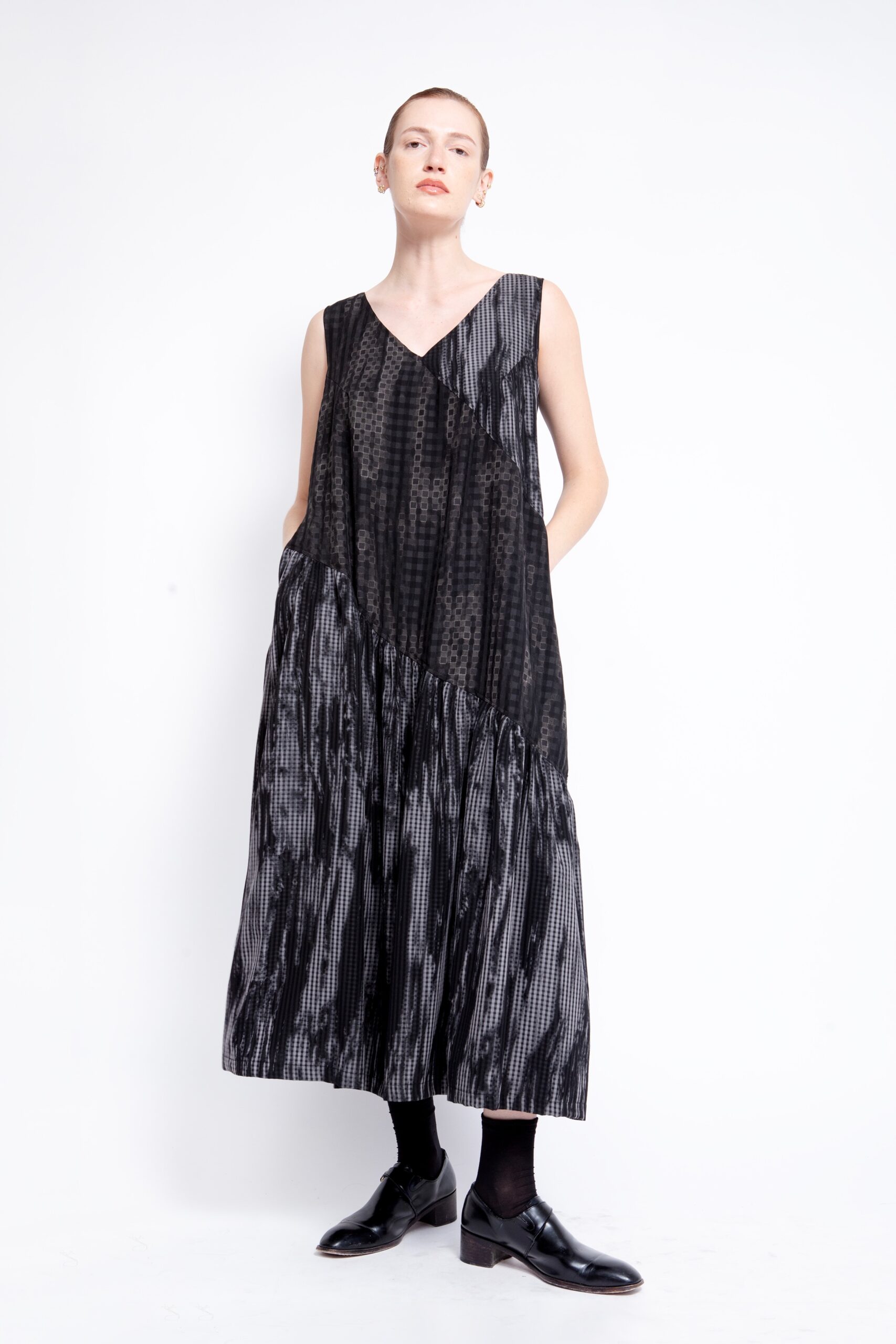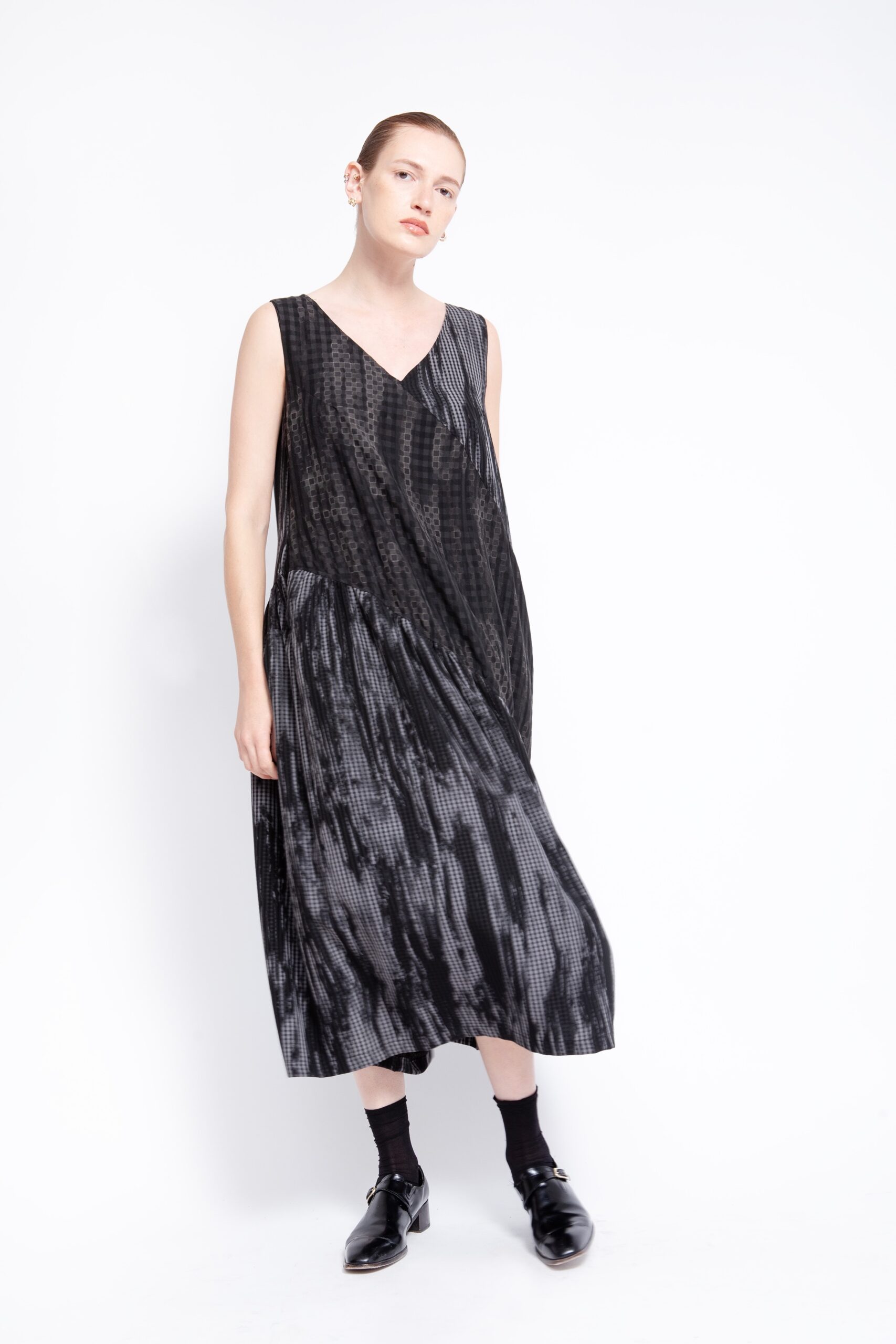 שמלה מבד אריג נשפך, בגזרת V מעטפת