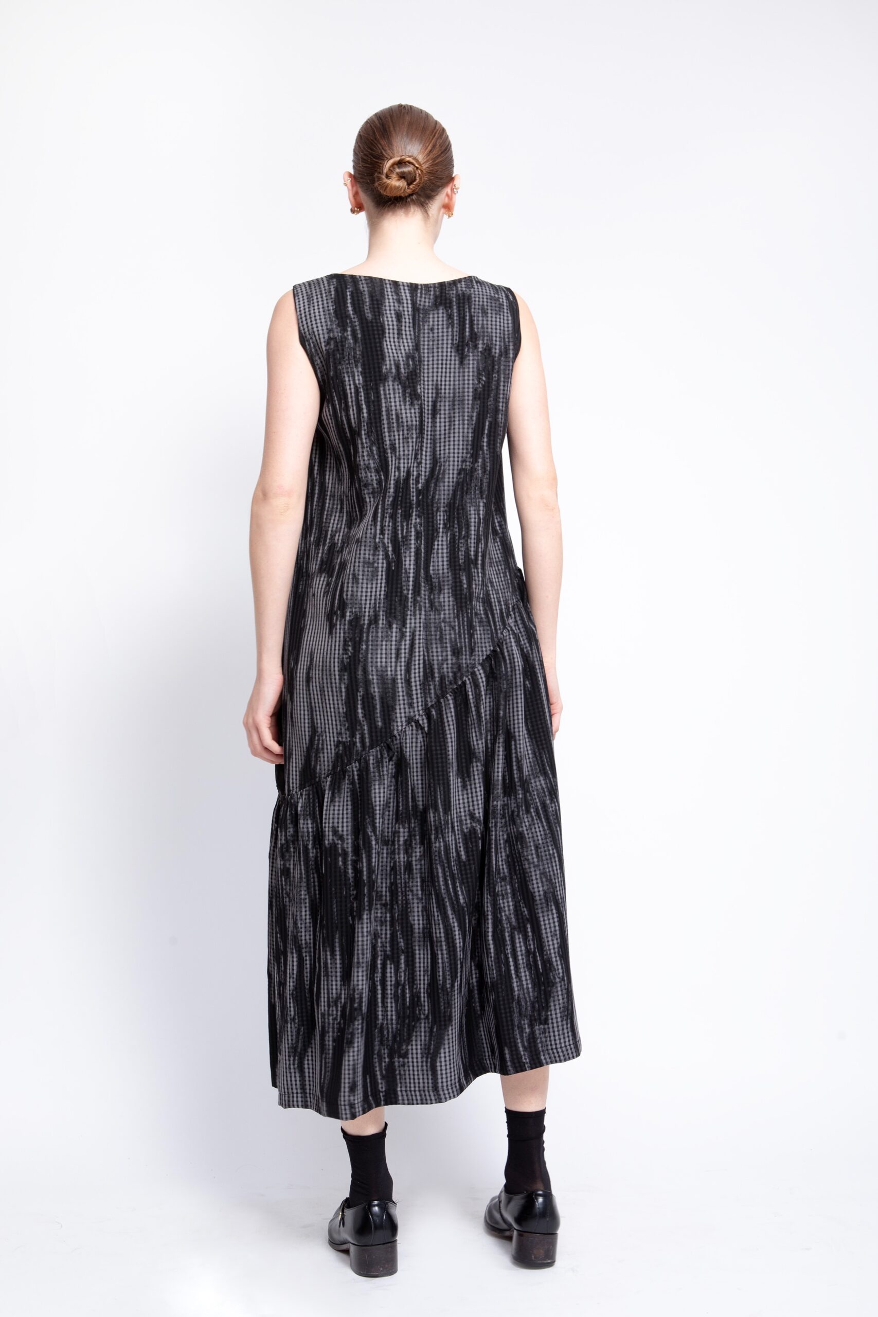 שמלה בגזרת A מתרחבת ומחמיאה, עם תיפורים אלכסוניים היוצרים תנועה