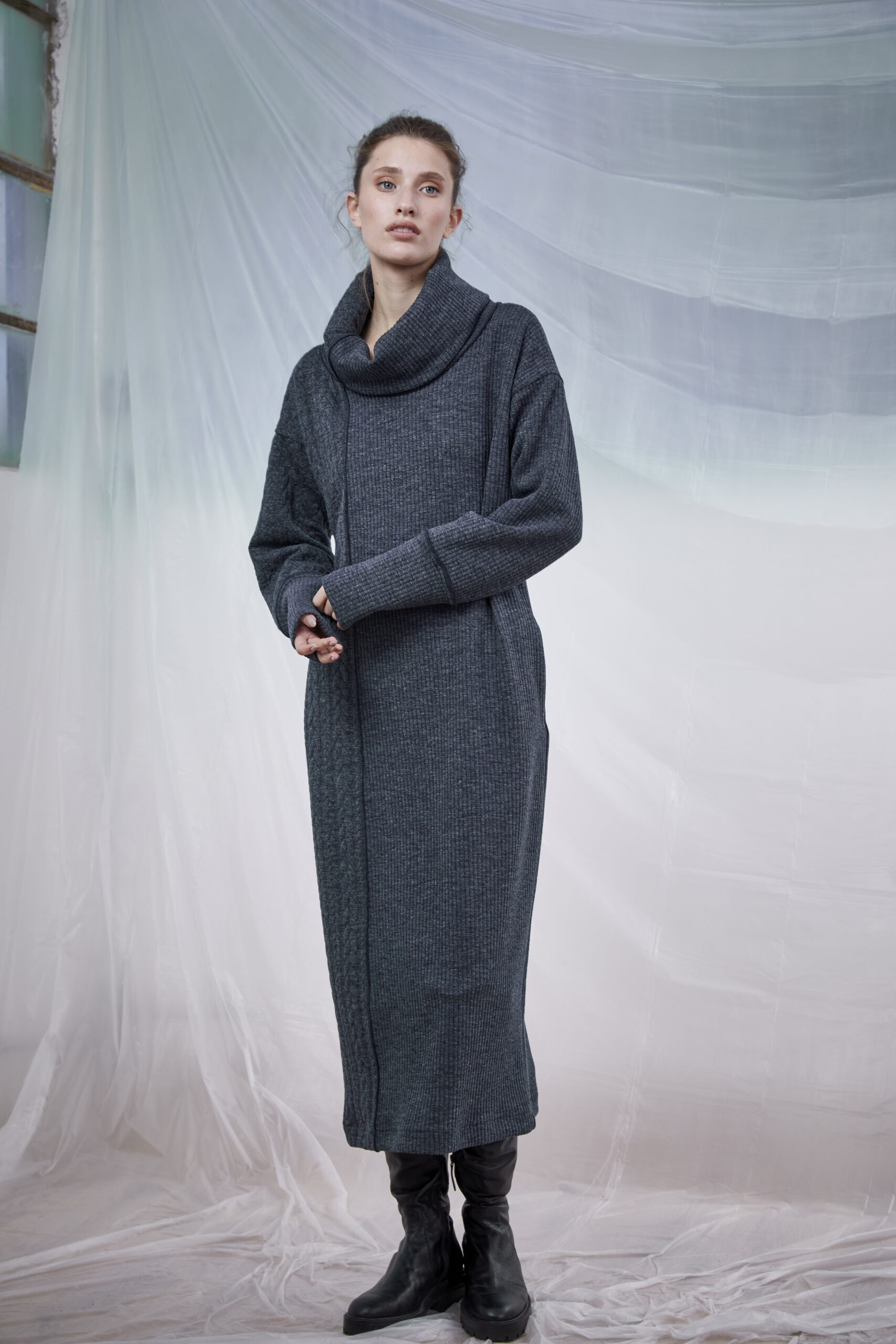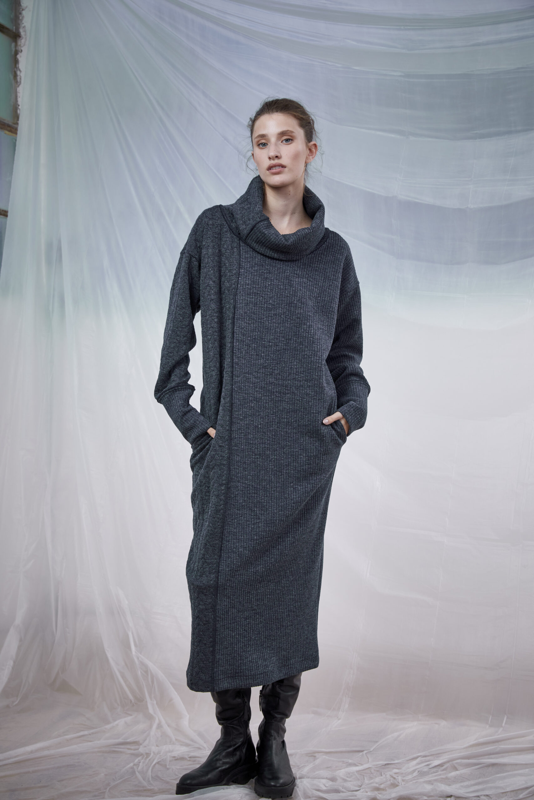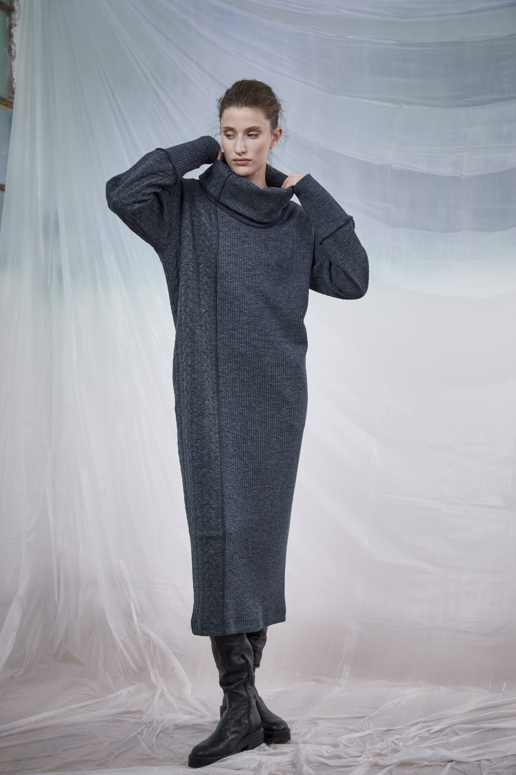 שמלת סריג צמות בשילוב סריג פטנט עם צווארון גולף