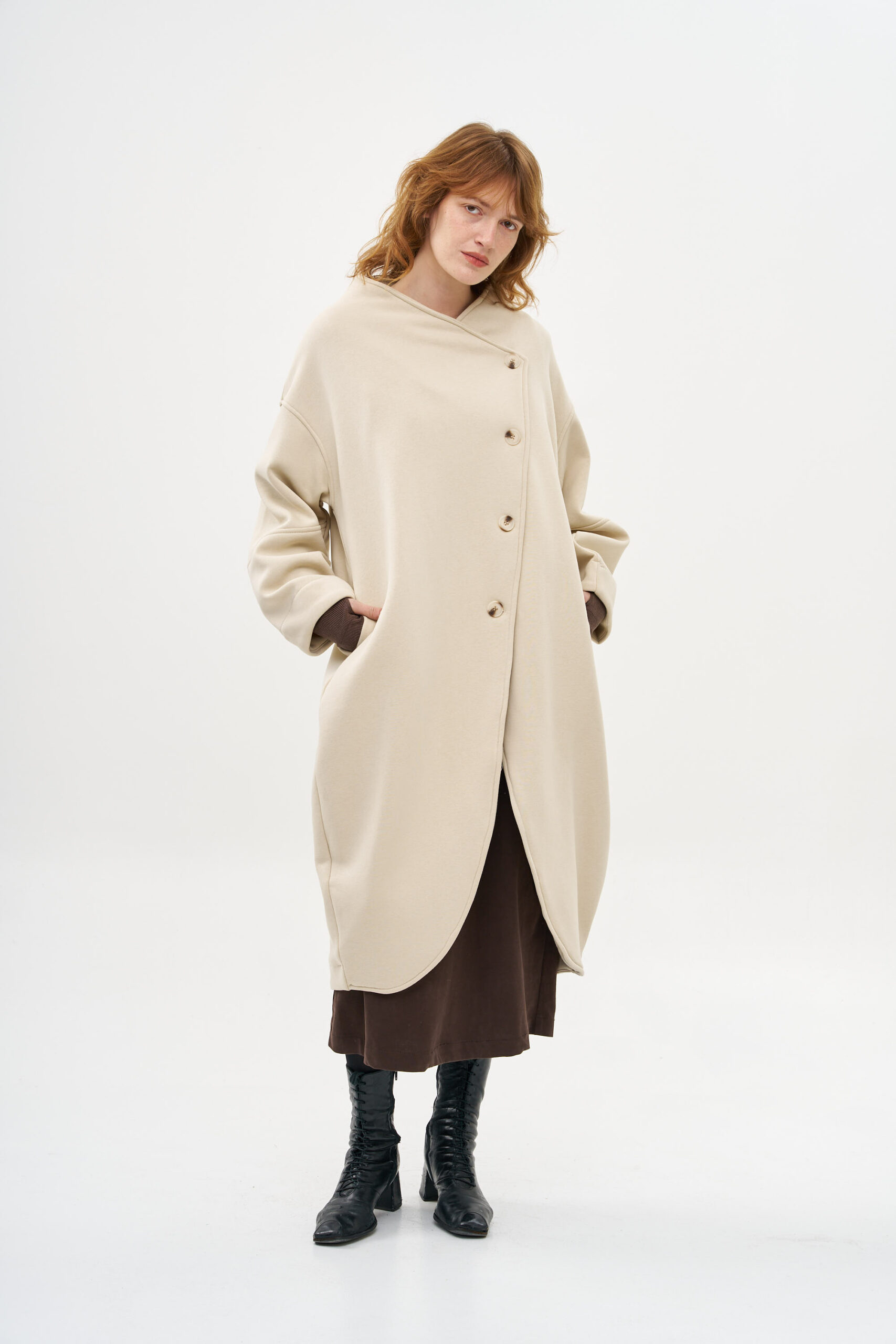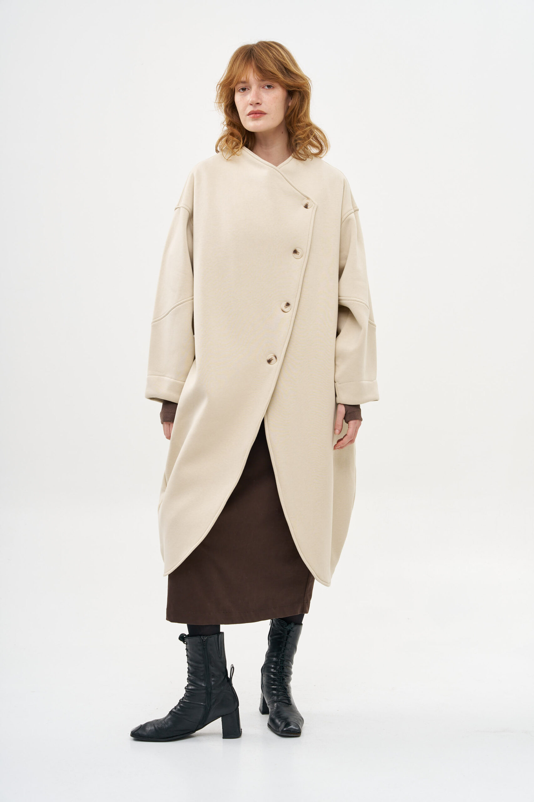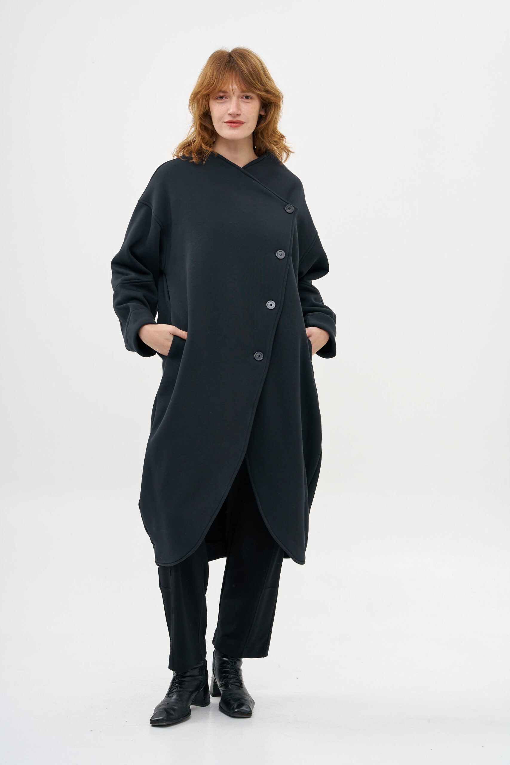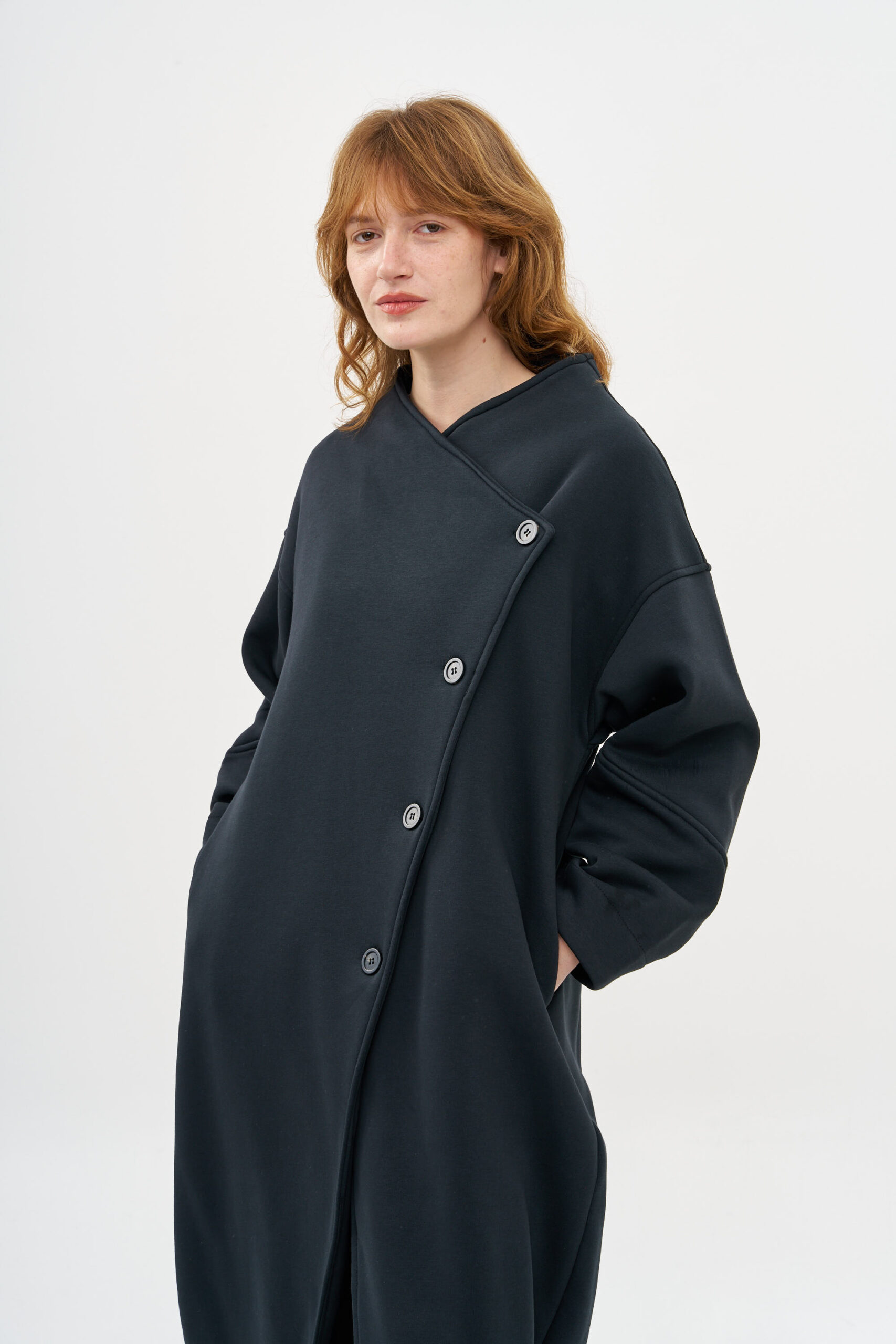 מעיל עם מפתח אלכסוני בחלקו הקדמי, פריט ייחודי, המוסיף עניין למלתחה