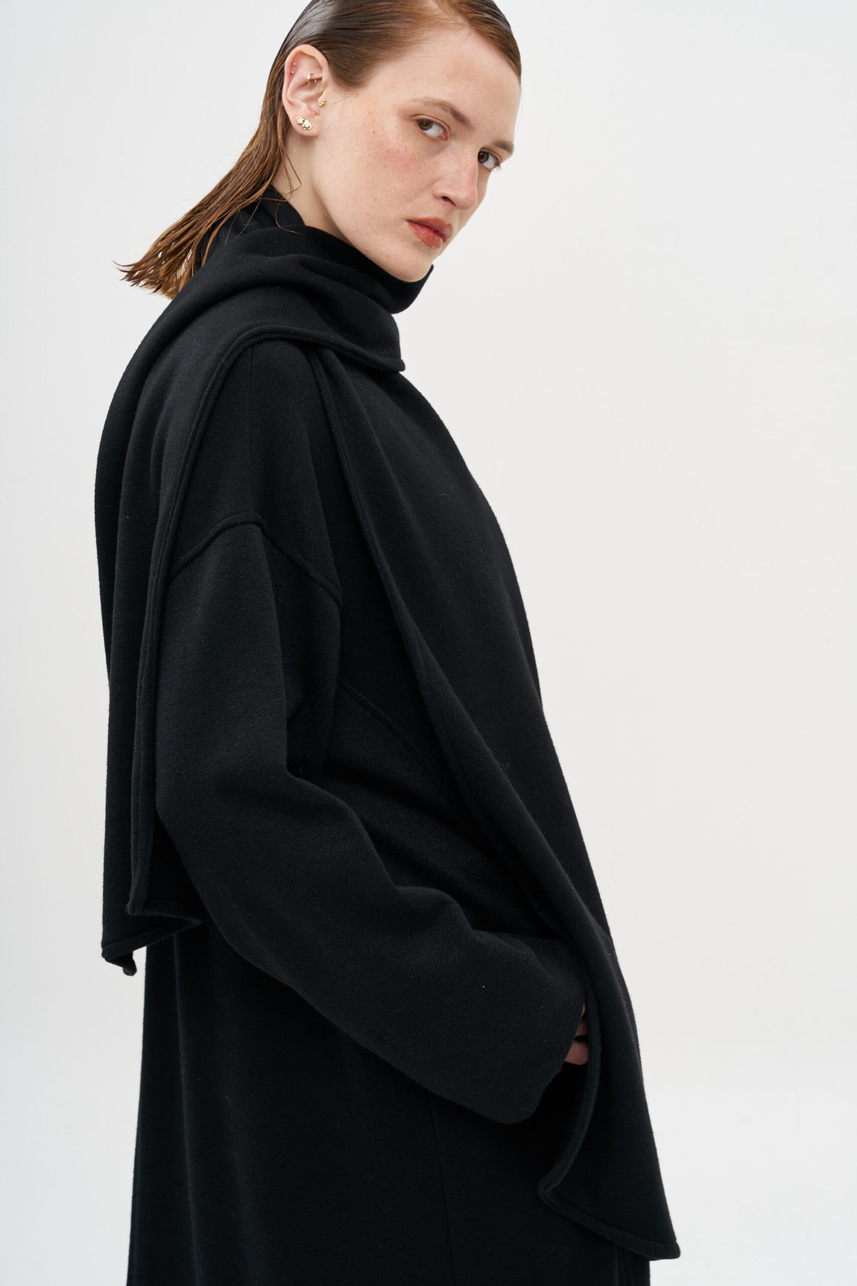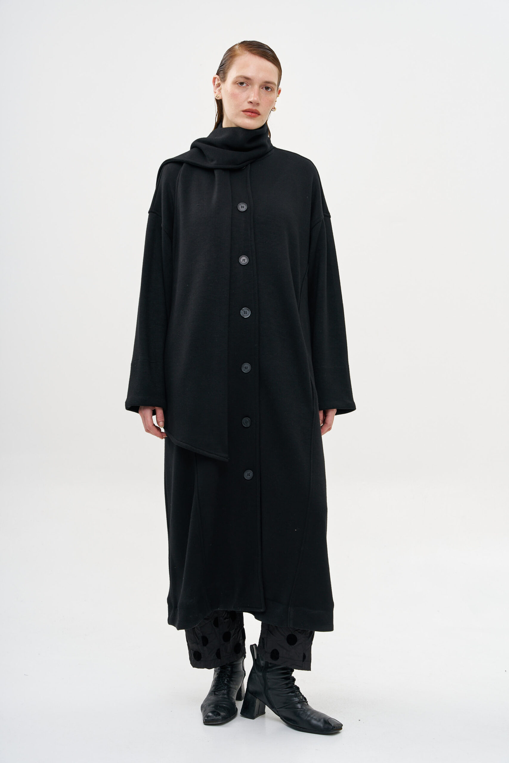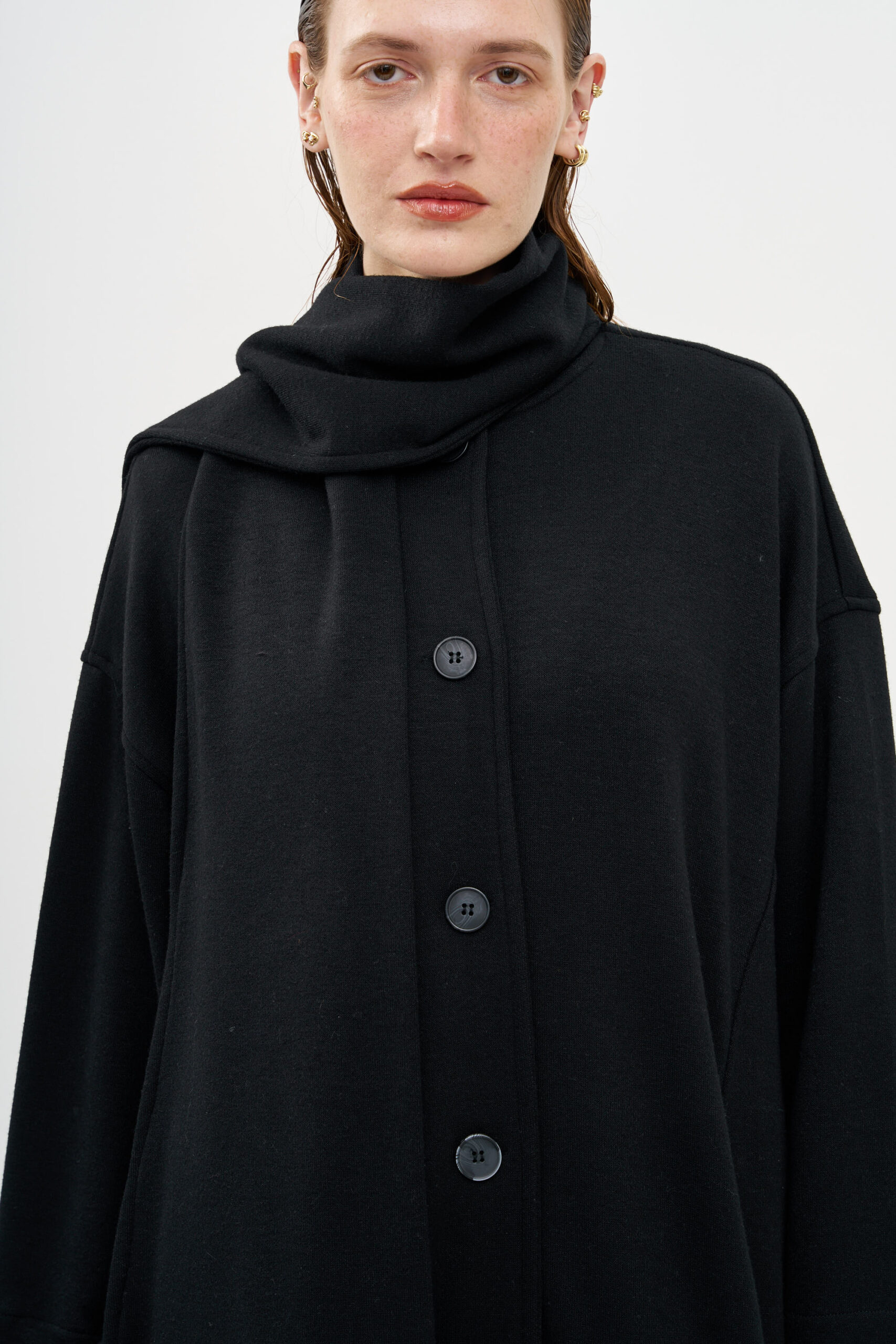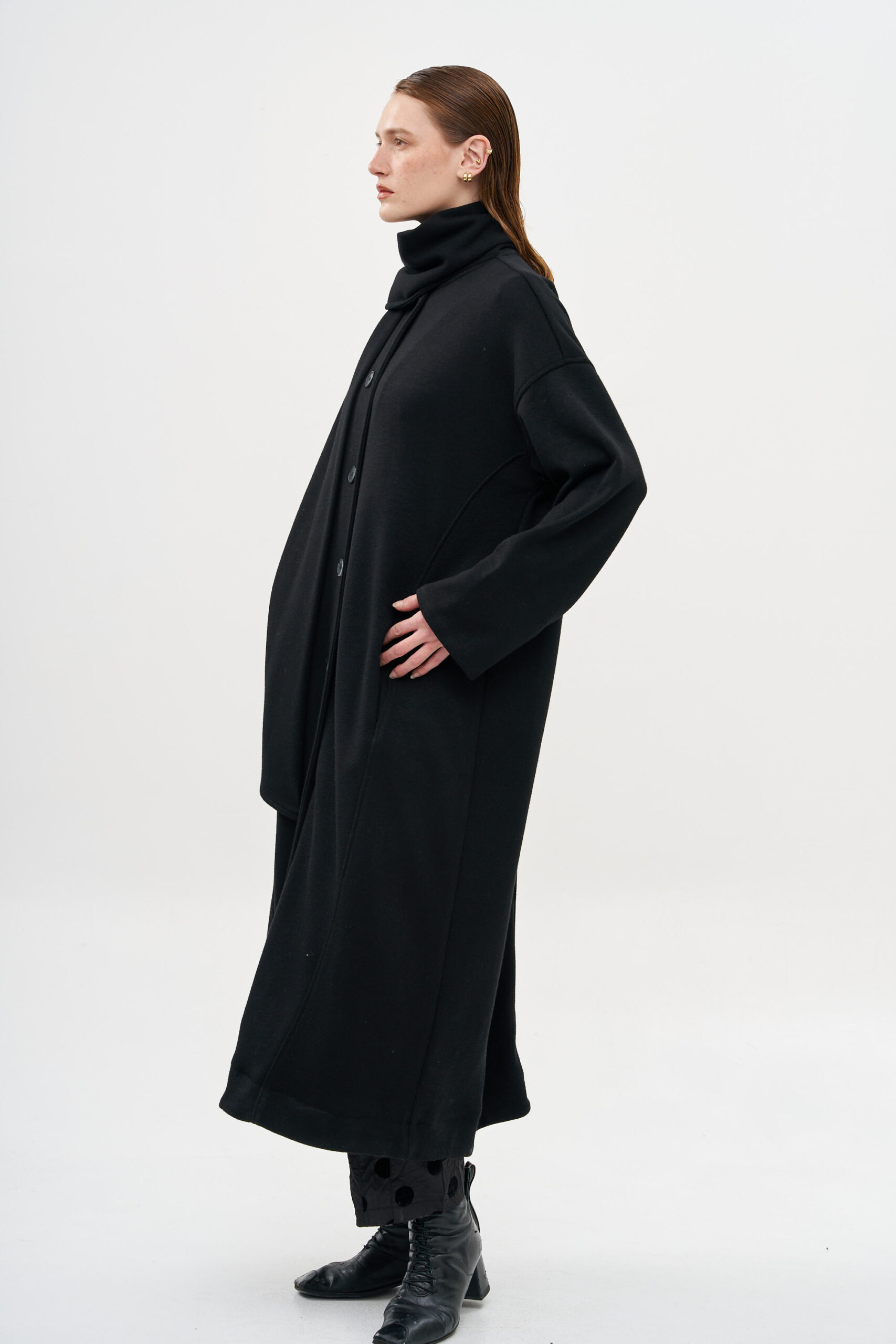 מעיל עם סגירת כפתורים, בגזרה נשפכת ומלאת נוכחות,
