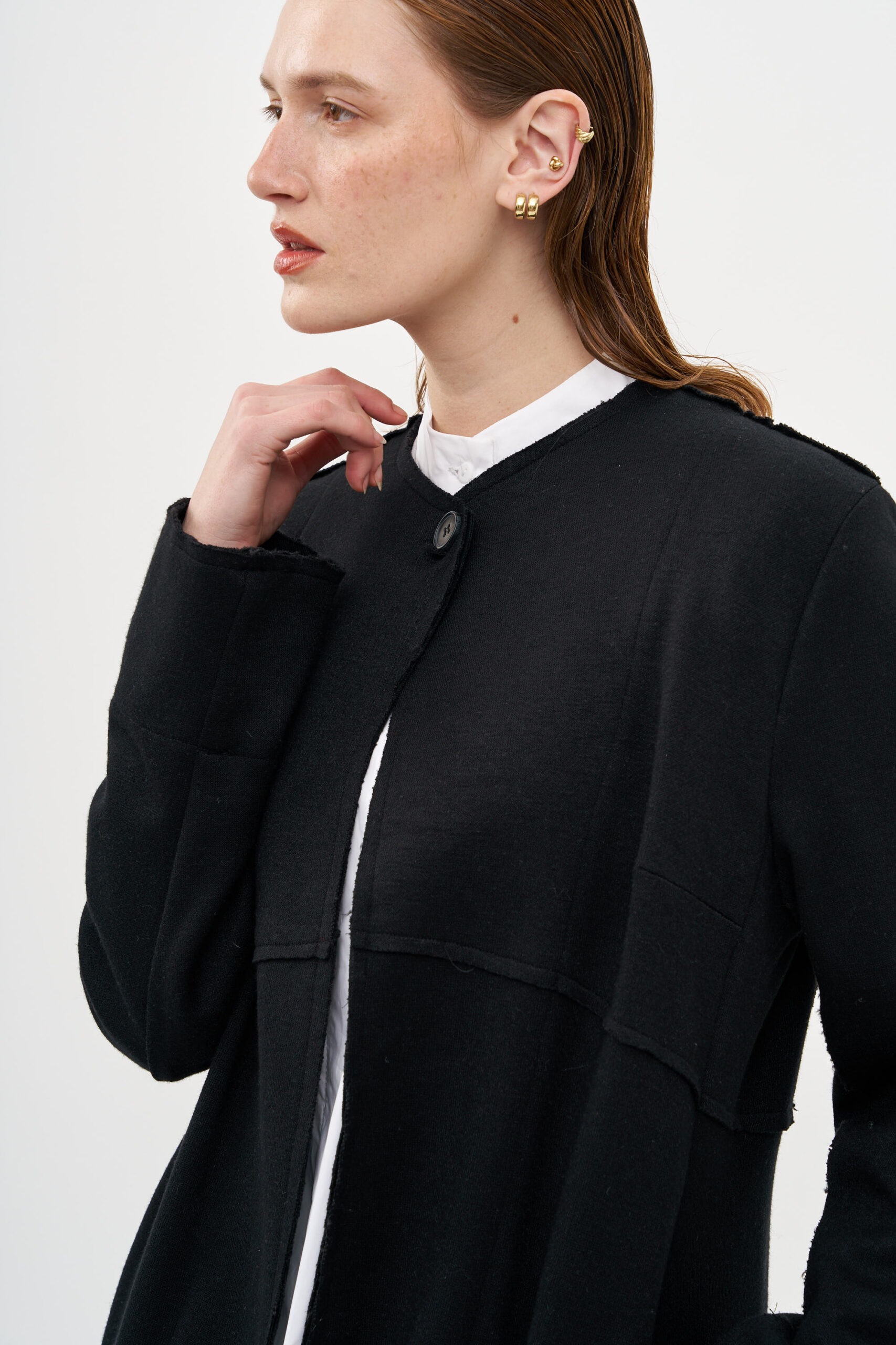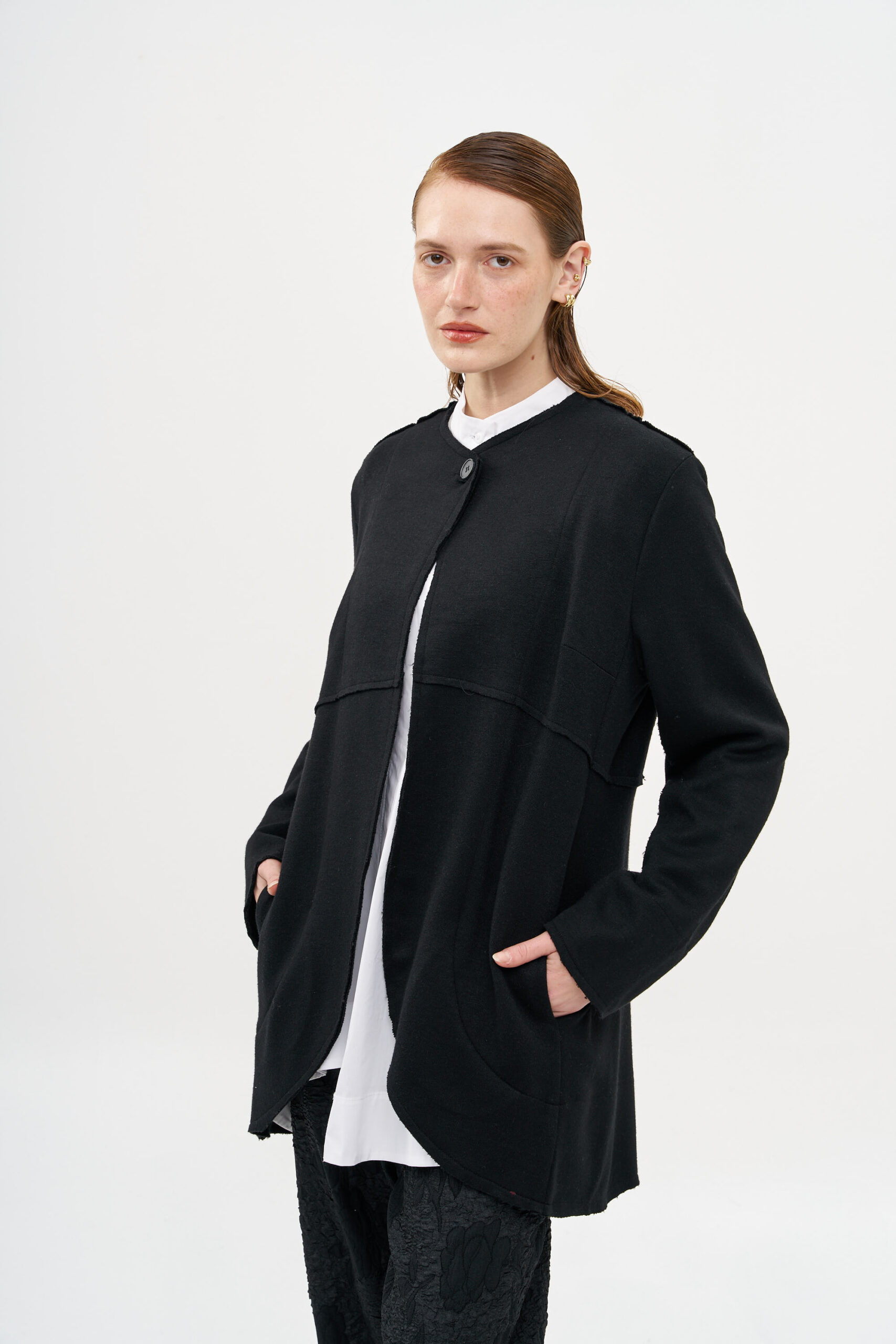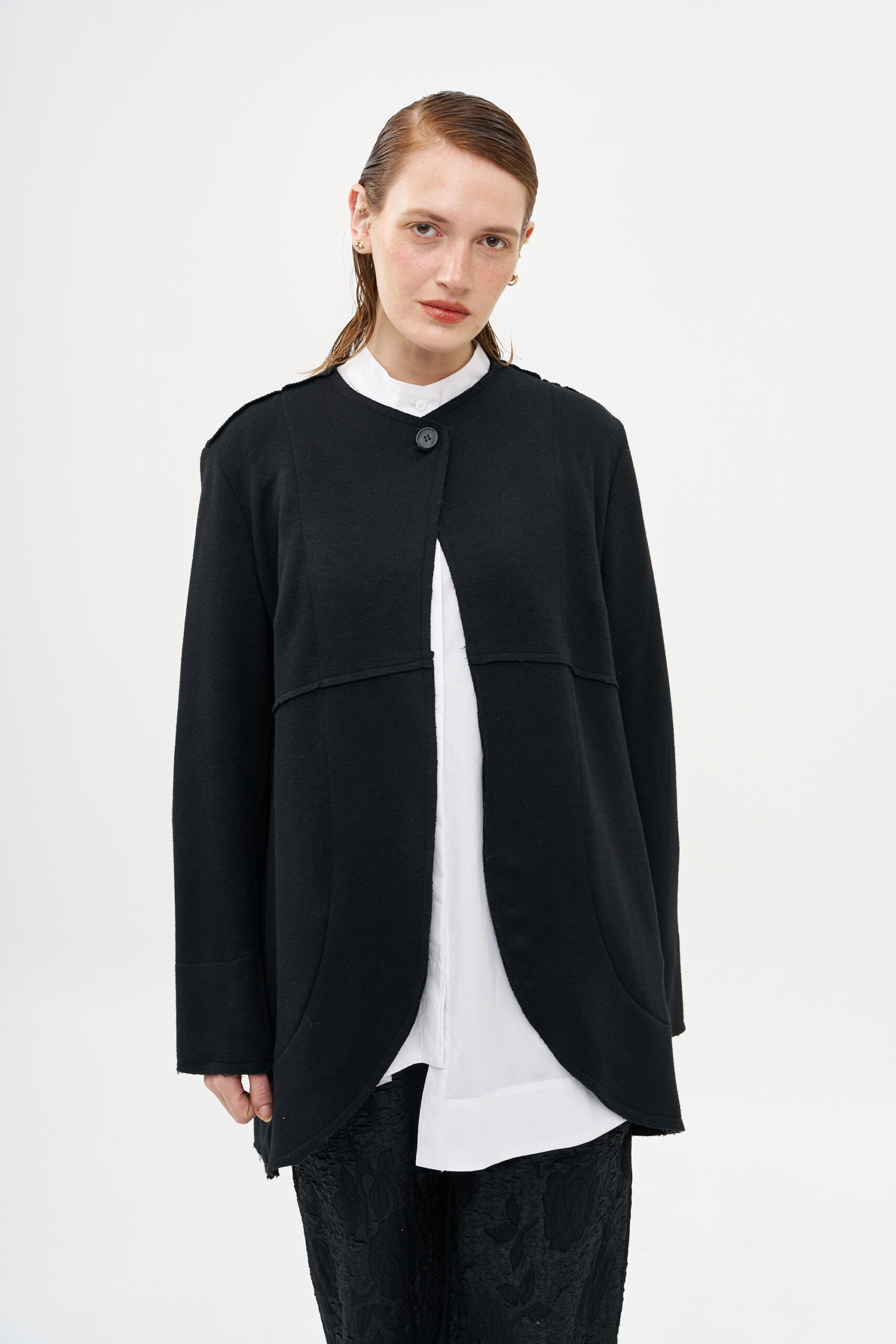ג'קט בגזרה המלווה את הגוף, עם תפר מחמיא מתחת לקו החזה